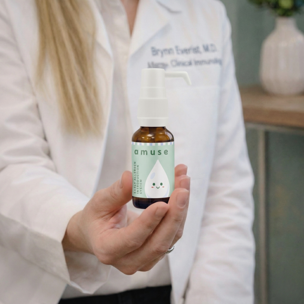 Amuse is an early allergen introduction system for infants 2 months and older. Developed by a board-certified pediatric allergist, our daily drops deliver precise microdoses of six major allergens (peanut, cashew, walnut, sesame, egg, and milk) to support your baby’s developing immune system during the critical window when food tolerance is established.